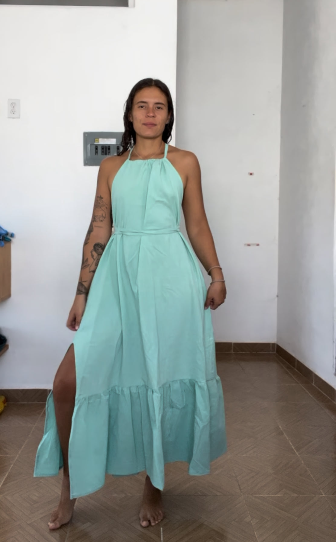 Vestido de manta gruesa, abierto de un costado y con espalda descubierta.